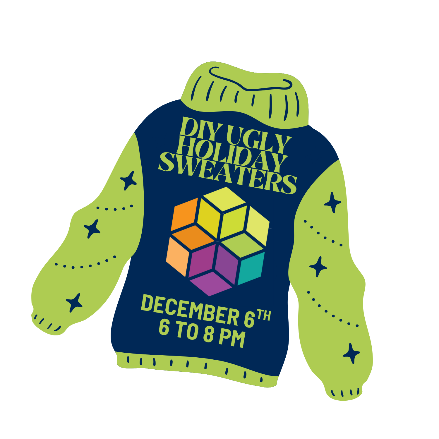 You’ll receive a plain sweater and all the materials needed to transform it into a uniquely festive Ugly Holiday Sweater. From glitter and tinsel to pom-poms and bells, we provide everything to make your sweater truly one-of-a-kind.